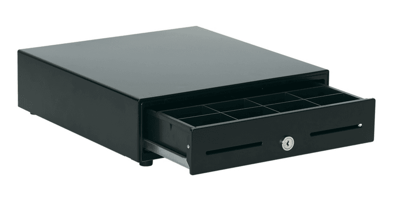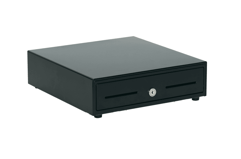 Zewnętrzne wymiary wynoszą 330 mm szerokości, 343 mm głębokości i 90 mm wysokości. Dzięki temu szuflada doskonale pasuje do standardowych stanowisk kasowych i nie zajmuje dużo miejsca.